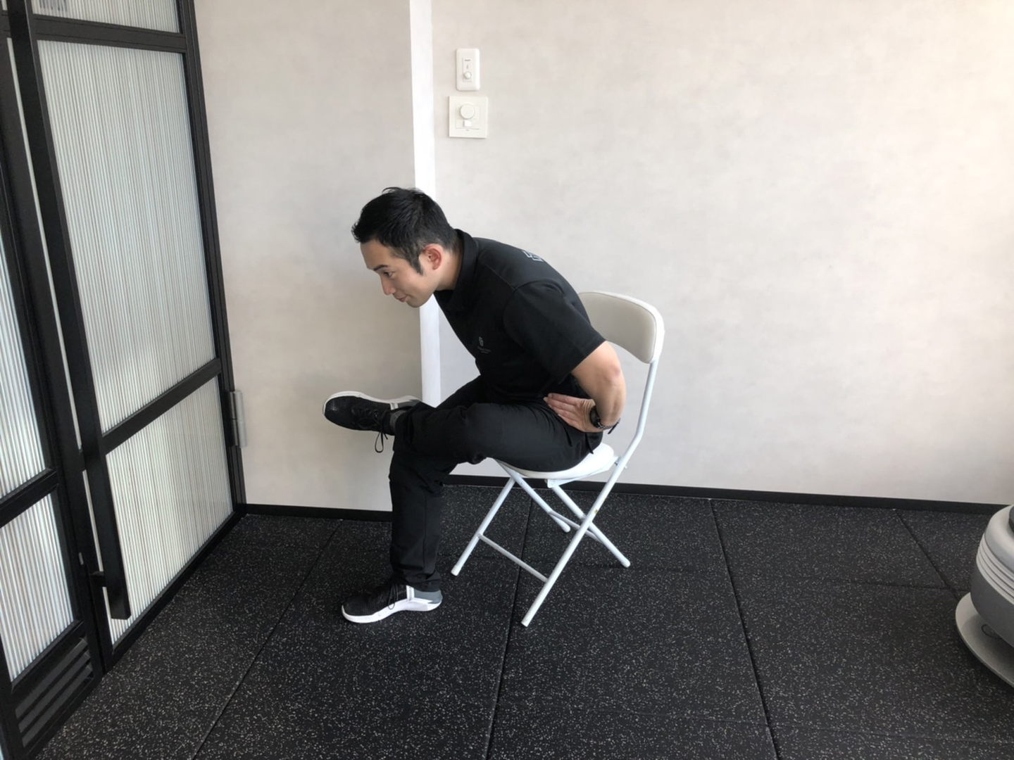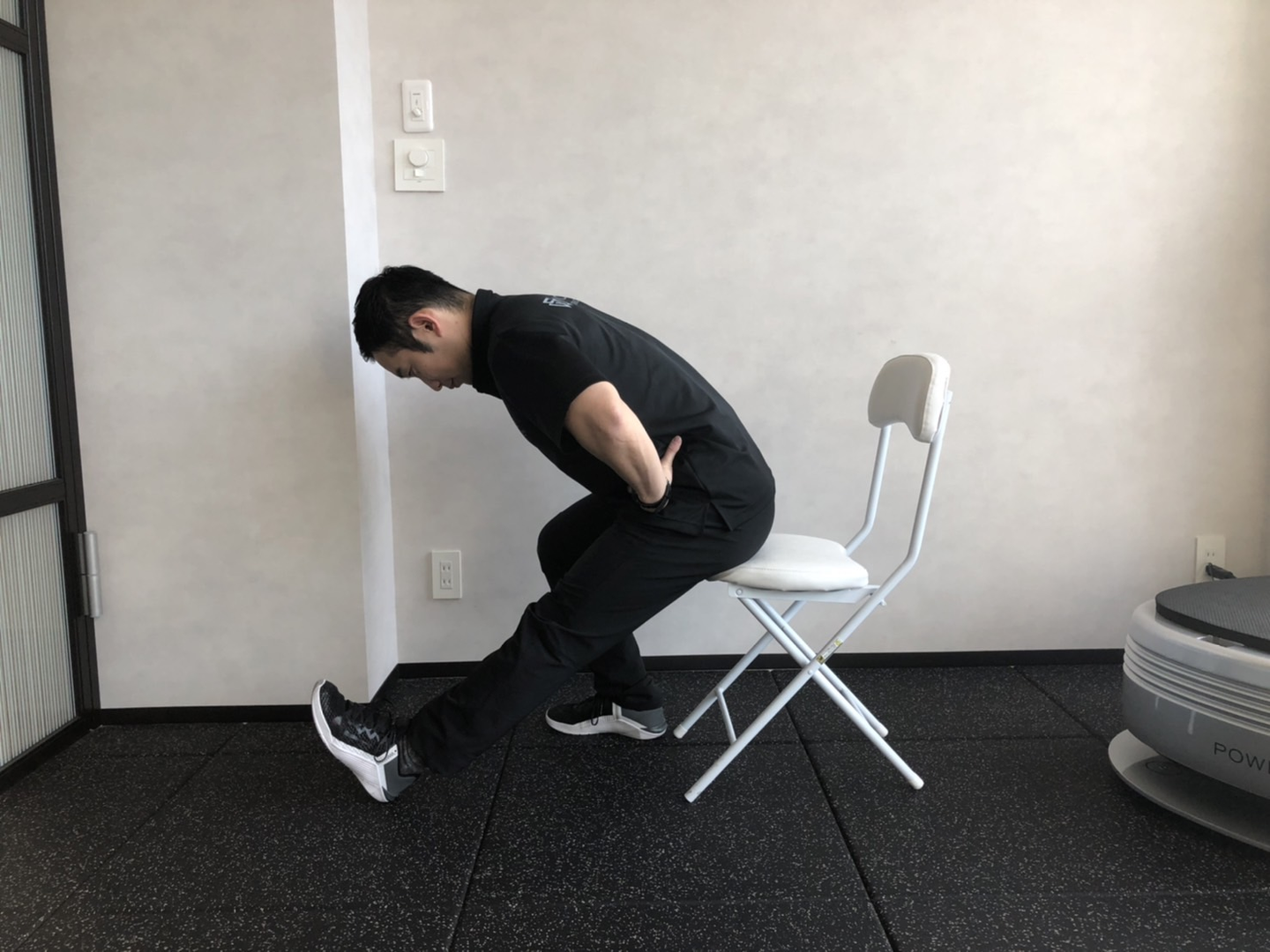 ストレッチ手順①イスに座り、片方の足を乗せる