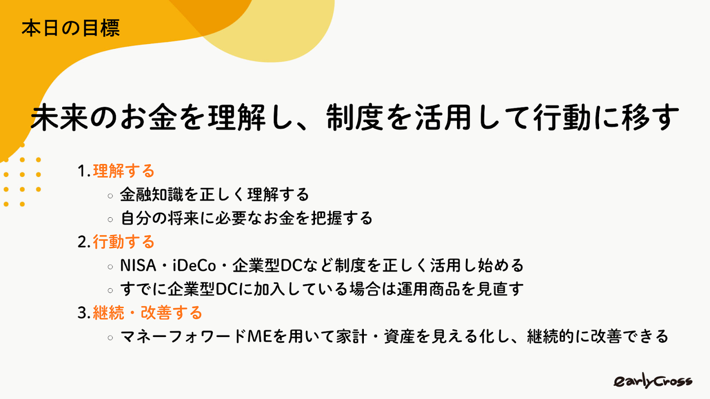 今回の「おかねの教室」は、「未来のお金を理解し、制度を活用して行動に移す」を目的に、次のような流れで進めました。