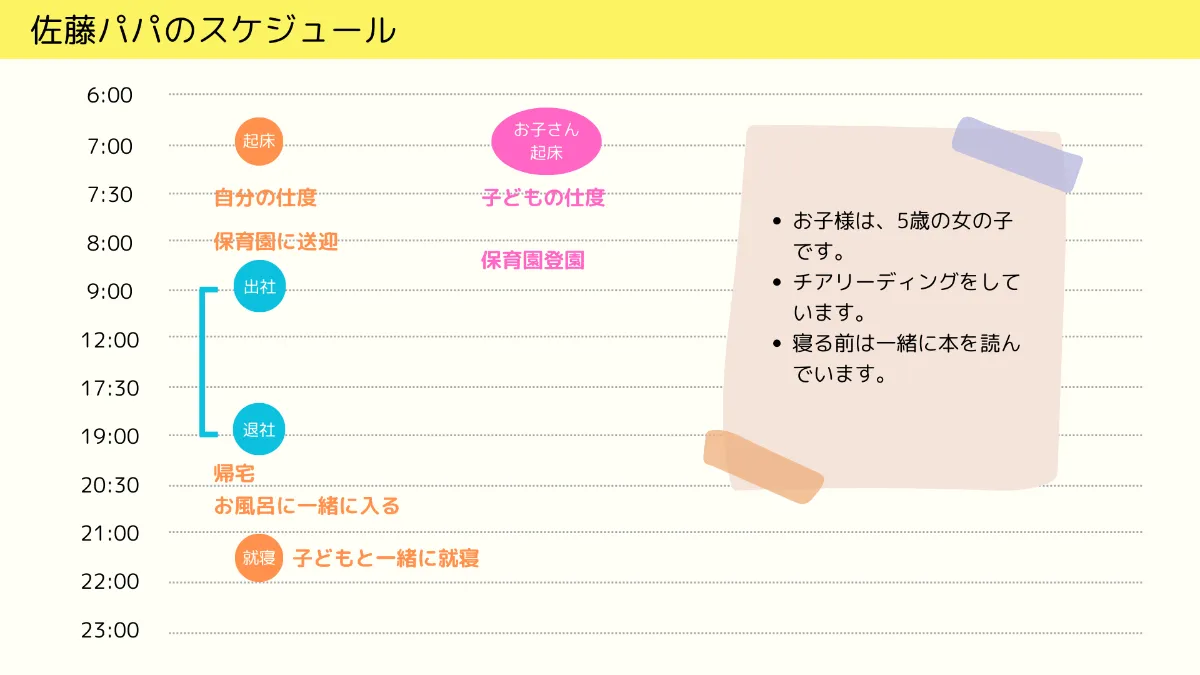 💡 佐藤さん:「朝は子どもを保育園に送って、夜はお風呂・歯磨き・読み聞かせがルーティン」