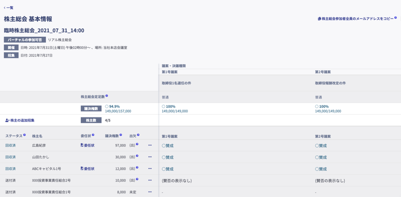 各株主総会の管理画面。委任状の回収状況がリアルタイムで反映されます。