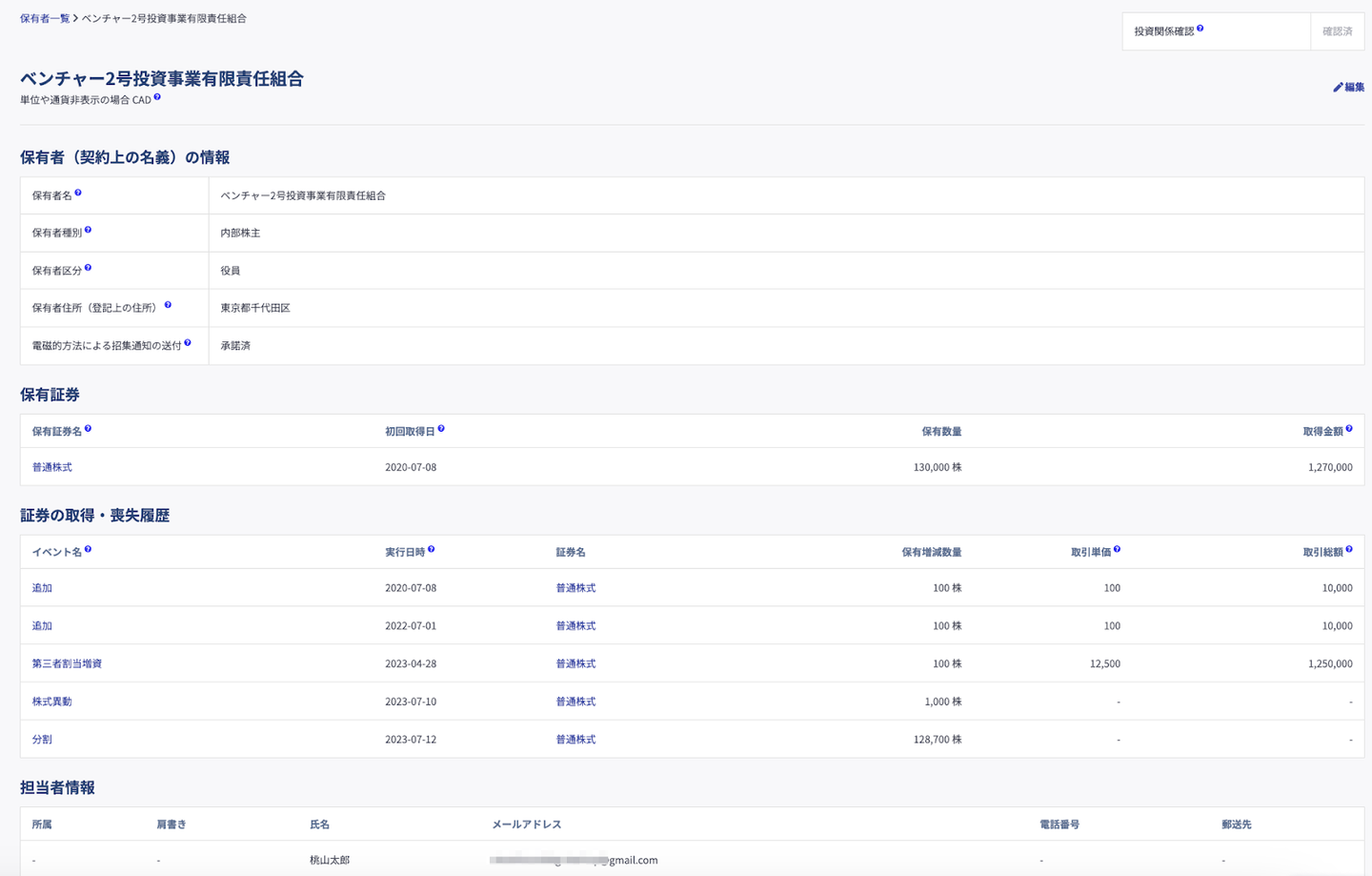 smartround内の証券データでは、株主ごとの保有証券や取得・喪失履歴、担当者のメールアドレスなどを一元的に管理できる。