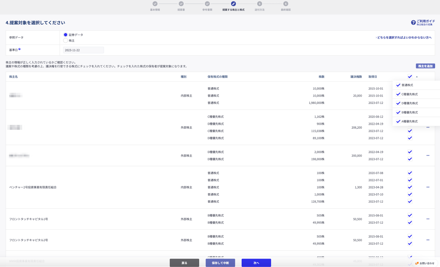 株主総会smartroundの画面。送付対象の株主をワンクリックで選択でき、招集メールが送られる。