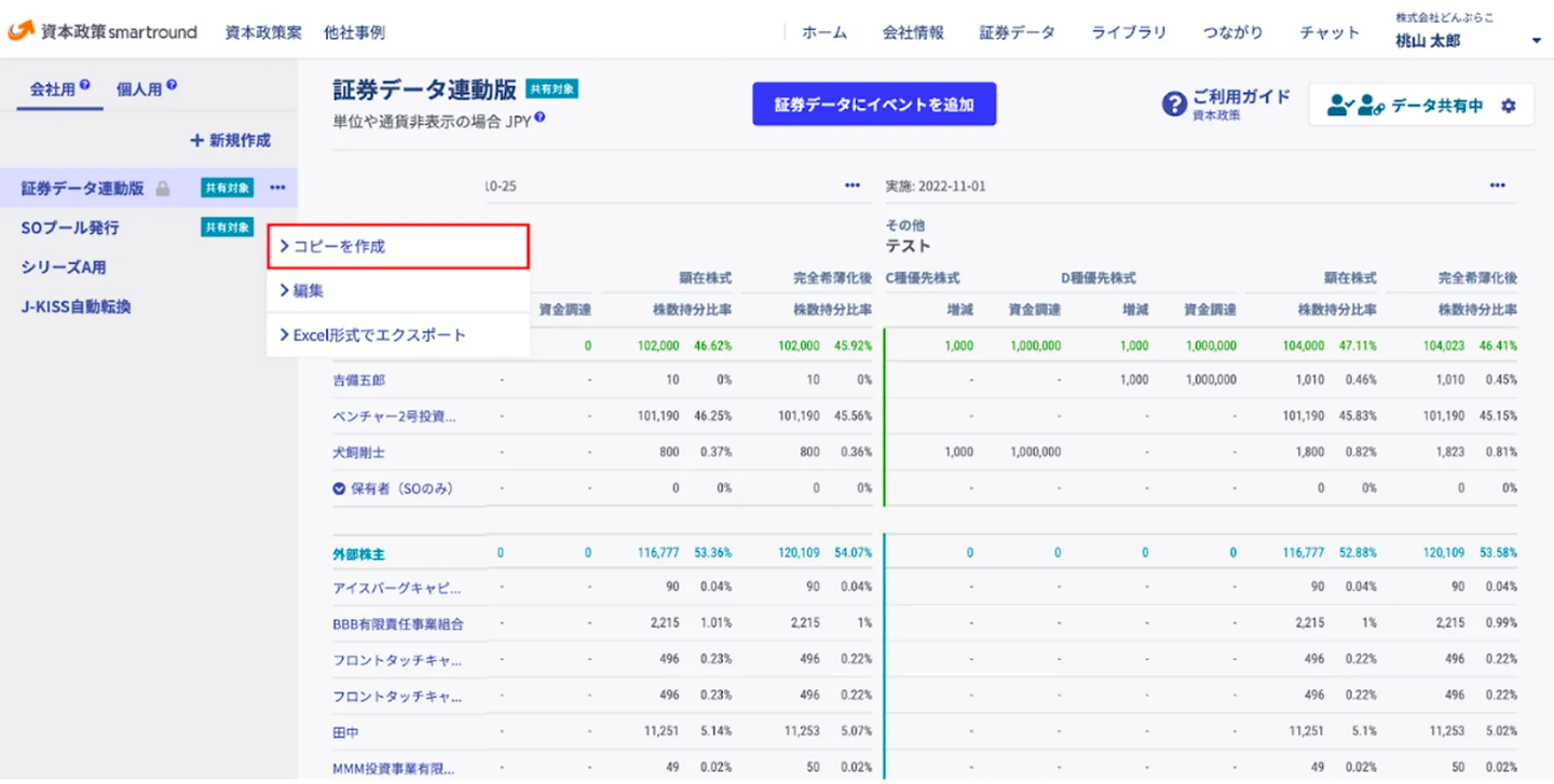 資本政策smartroundは実際の資本政策をコピーし、シミュレーションを何パターンにも分けて行える。