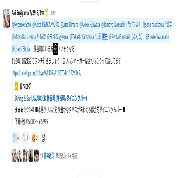 ランチに行く人を確認しているSlackです。