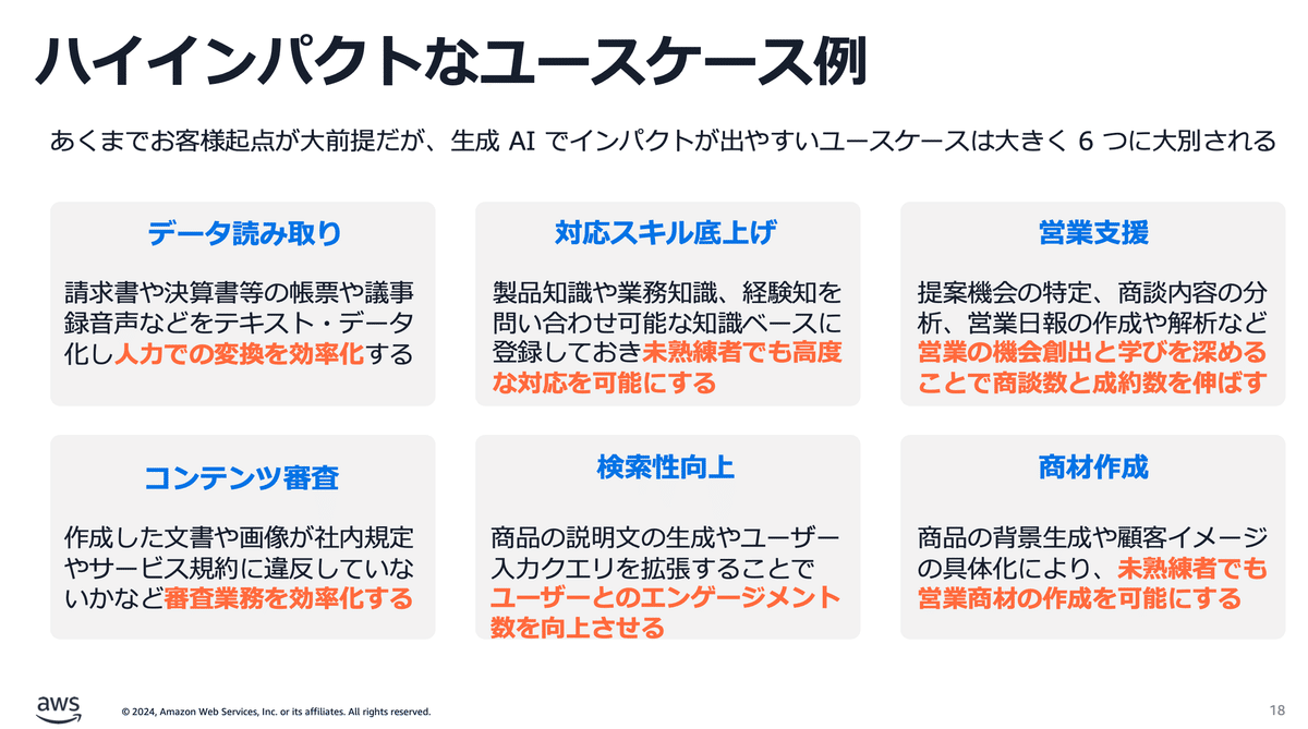 また、生成AIでインパクトが出やすいケースの例も資料の中にありましたので参考のために貼っておきます。スマートラウンドでもこれらのケースで利用することが多いので、とても納得みがありました。