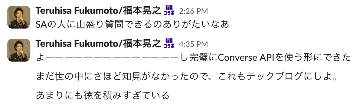 自分に関して言うと、Amazon Bedrockで最近リリースされた Converse API(以下参照)の存在を午前のワークショップで知ったので、その実装方法についてSAの方に相談させていただきました。