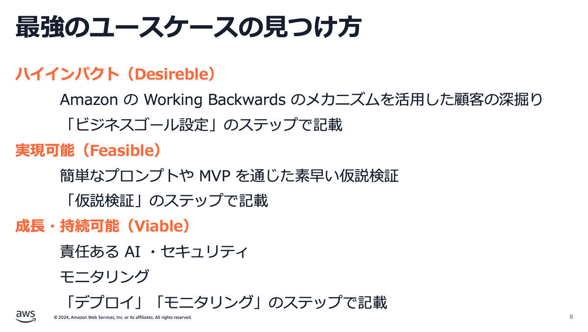 いきなりAmazon Bedrockを使い始めず「どのようなケースでAIを使うべきか」という、導入にあたっての観点の整理からはじめていただききました。ビジネスゴールをちゃんと設定するの大事ですね。