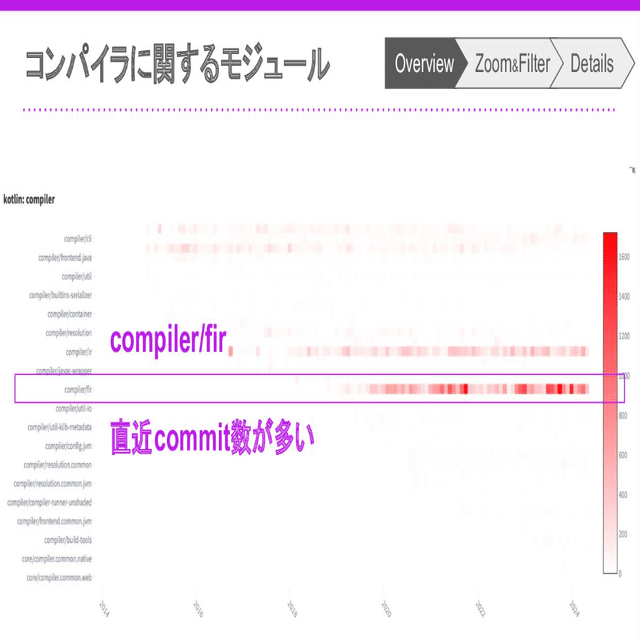 具体的には、commitのログからヒートマップを作り、ある時期に開発が活発だったファイルを割り出した上で、Kotlin Confでの発表内容を踏まえて「ある機能の構想や計画が、具体的にいつから始まっていたのか」というのを丸裸にしていました。