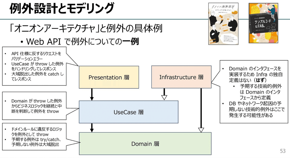 また、アーキテクチャによってどの層にどのような例外を書くか(サンプルコードはオニオンアーキテクチャでした)という観点の話もされており、例外をコードで表現する方法がスッと頭に入ってきました。
