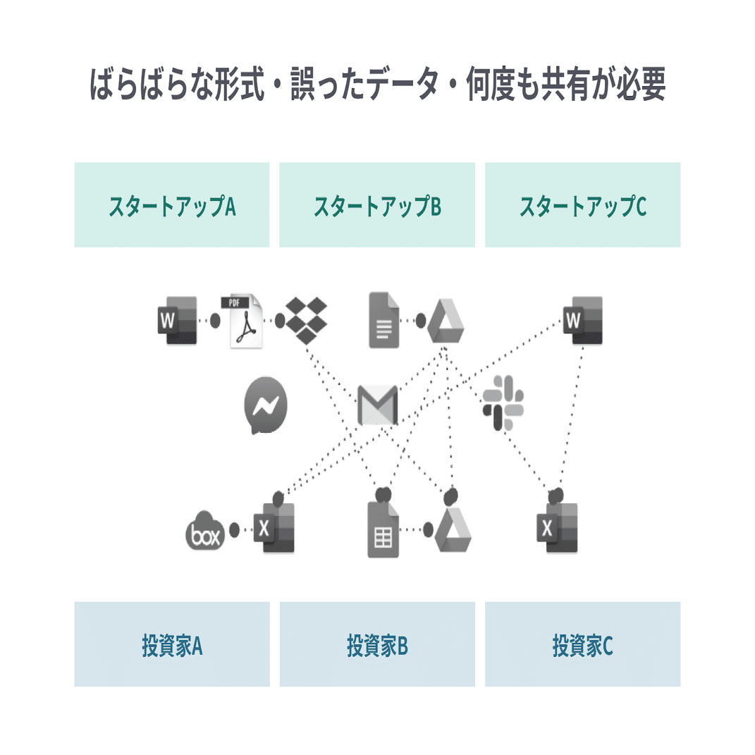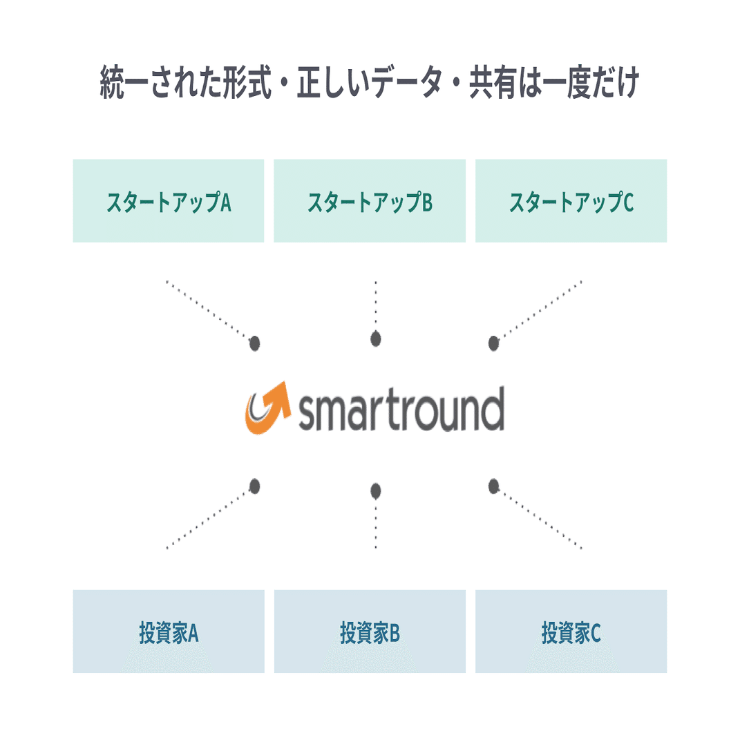 smartroundは、スタートアップ用のプラットフォーム上に登録されたデータやファイルを共有し、投資家用のプラットフォーム上でも閲覧できる仕組みを作ることで、共通課題を解決することに成功しました。「統一された形式で、正しいデータを、簡単に共有できる世界」の実現です。
