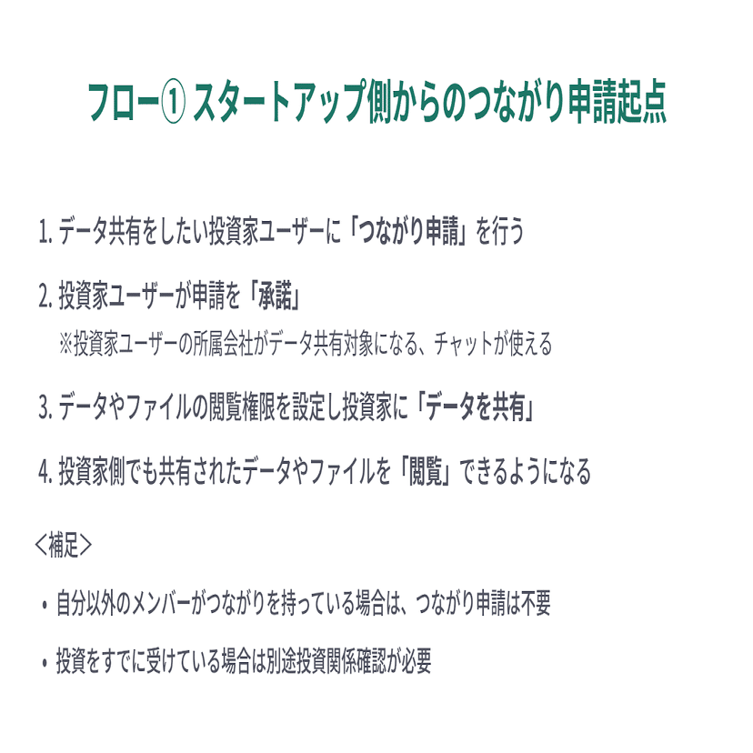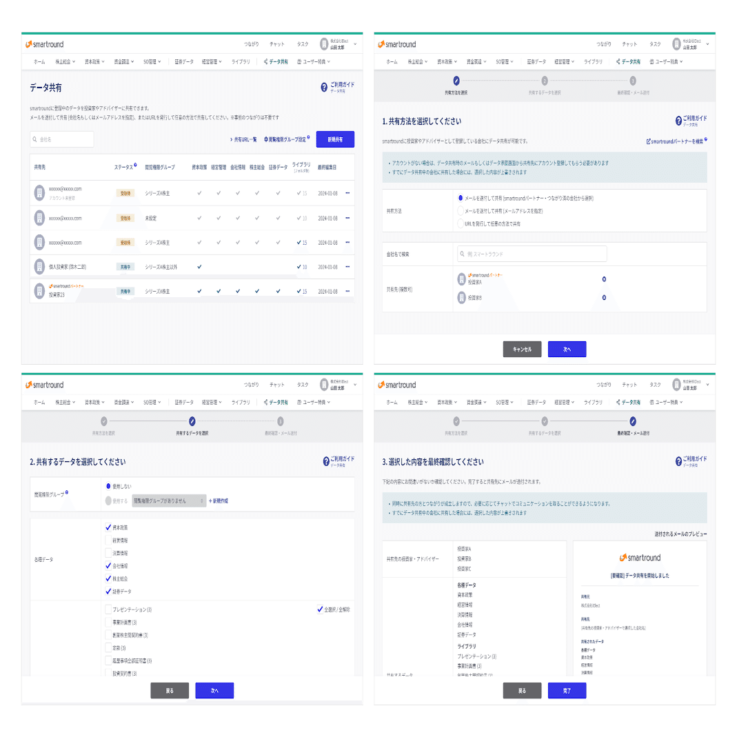 スタートアップのユーザーは、事前につながり申請を行わなくても、データ共有画面で「新規共有」をクリックし、ステップに沿って進めるだけで簡単に共有できます。