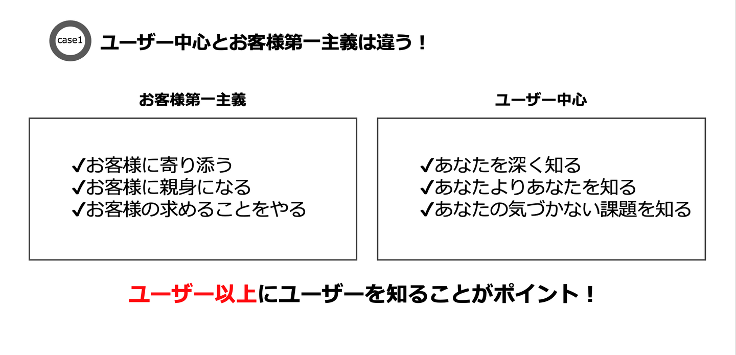 主観で入り込む、、、ふむ。ユーザー中心って、どういうスタンスで思考すると良いのでしょうか?