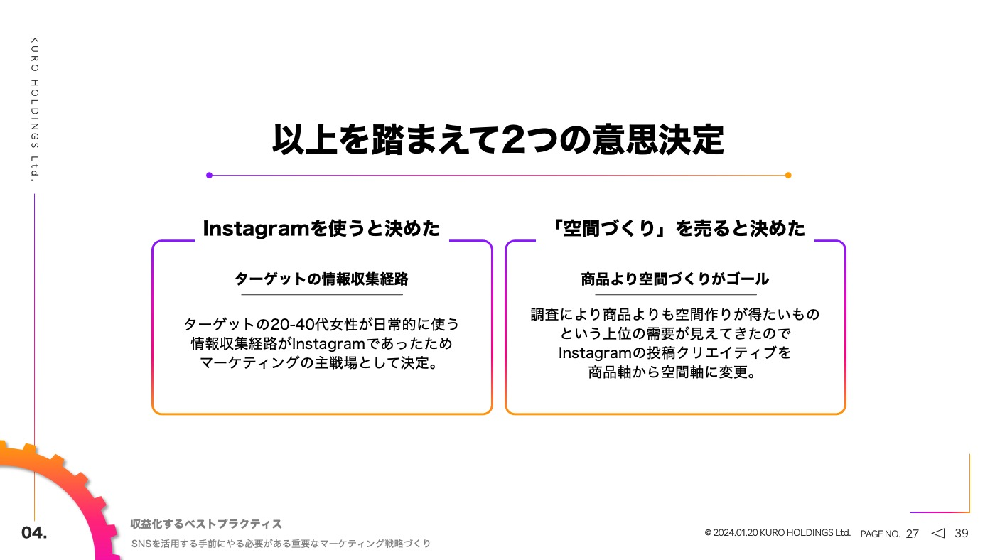 KURO HOLDINGSのテーマは<立ち上げから11ヶ月で黒字化!Instagramと広告の運用を「超有機的」に実行して収益化するベストプラクティス>。