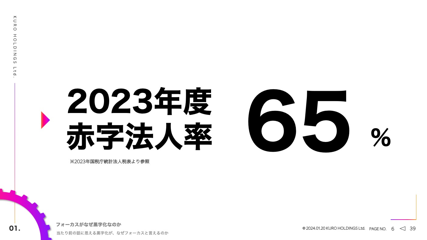 2023年は、国内で65%もの企業が「赤字」だったという現実があります。ちなみに会社設立後、5年後の生存率は15%、10年後の生存率は7%というデータも。