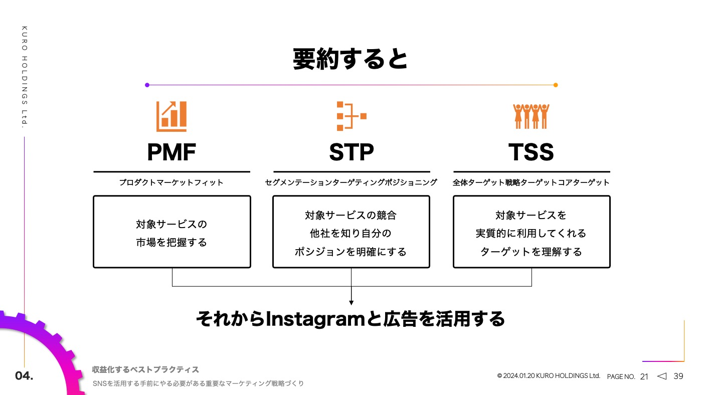 しかし、KURO HOLDINGSではSNSを運用する前に、「PMF・STP・TSS」の3ステップでマーケティング戦略を定めてからその戦略に合う手段を選ぶという順序が大切だと考えています。
