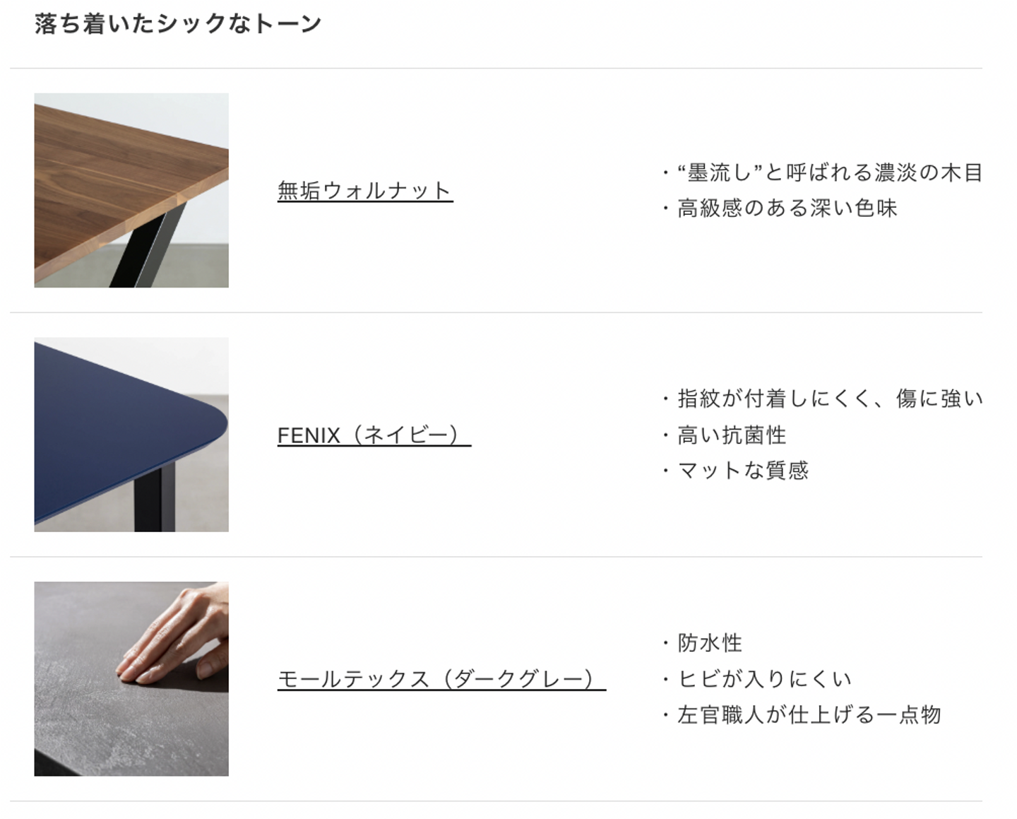 KANADEMONO の THE シリーズの天板ではこういった木目シートを採用していません。天然木(幅はぎ材、集成材、突板)をはじめ、リノリウムや FENIX といった機能性素材、左官職人が1枚ずつ仕上げる MORTEX 天板などを取り扱っております。