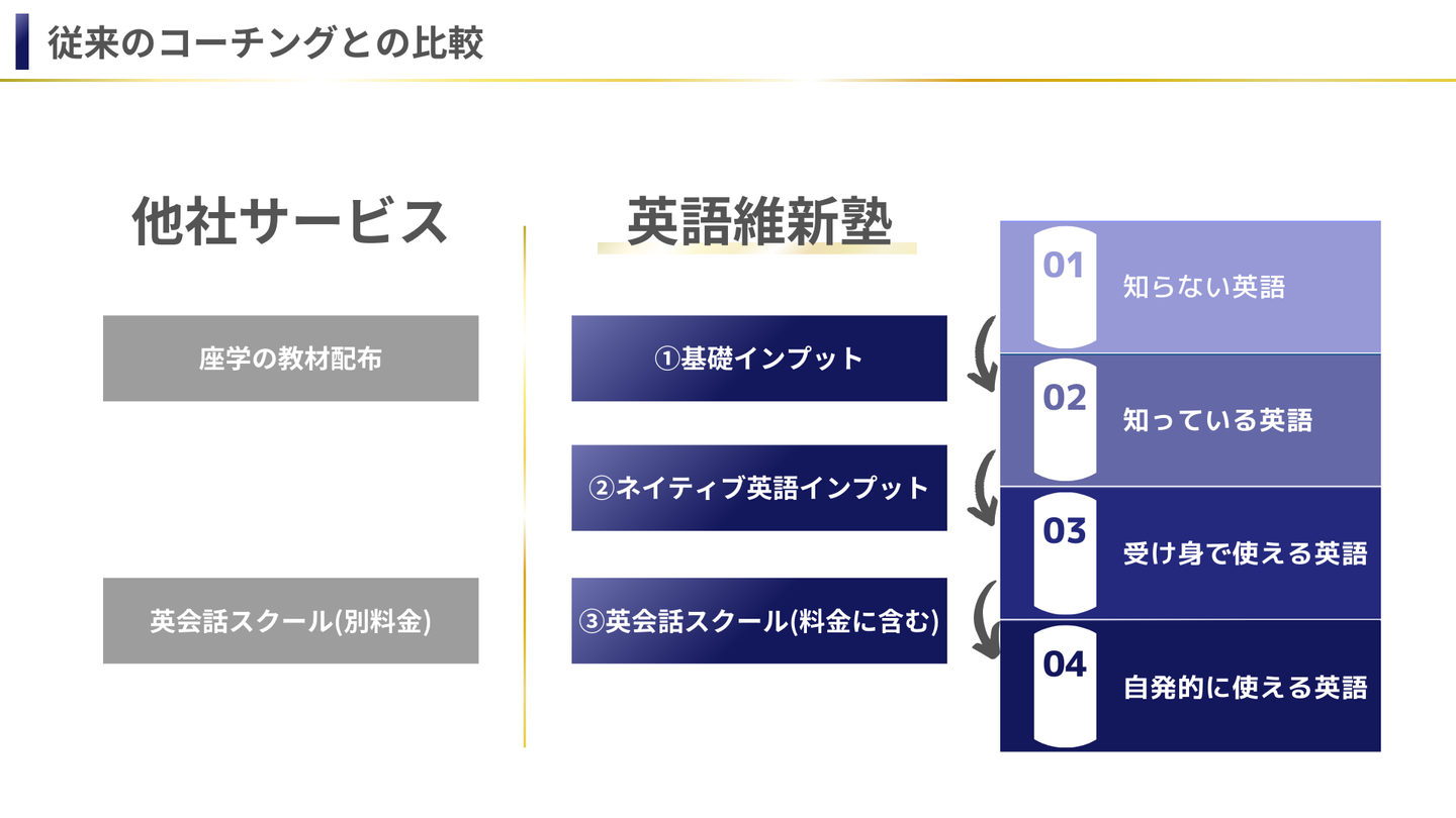 弊社は、基礎を徹底しろという従来の英語コーチングでもなく
