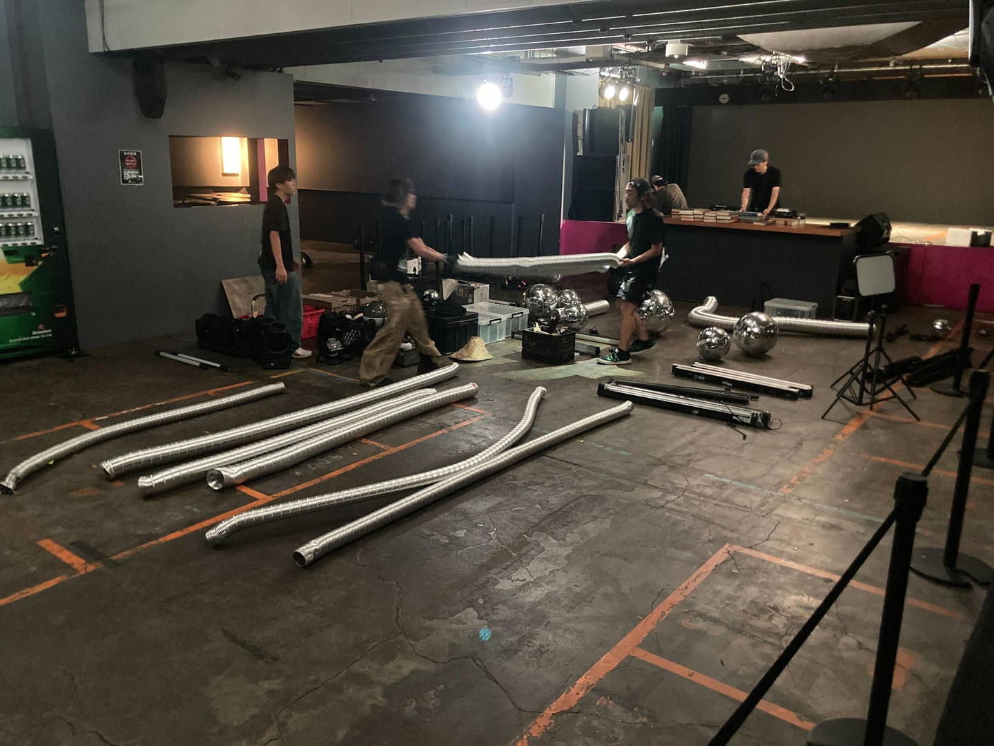 お昼のアイドルイベントの最後の特典会が行われている横で、着々と夜のライブに向けてステージの準備が始まりました。横でアイドルイベントの特典会が行われているため、邪魔にならないよう少人数で準備をしています。