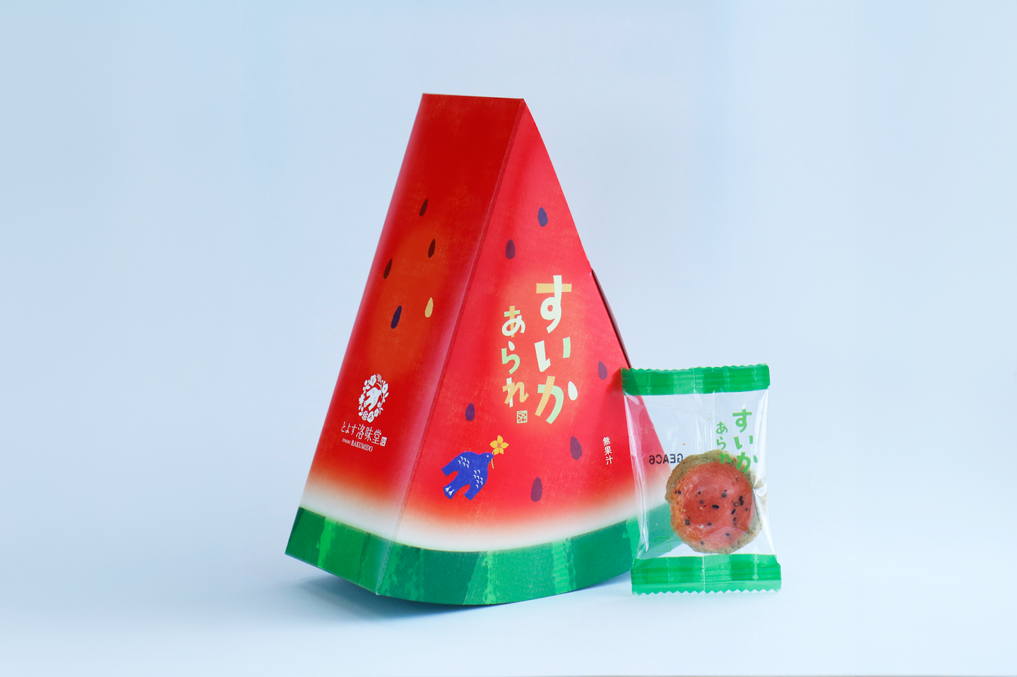 今回ご紹介するのは、とよす株式会社 『とよす洛味堂』の季節限定商品「すいかあられ」のパッケージデザイン。毎年人気の季節商品ですが、この度デザインリニューアルのご依頼をいただきました。