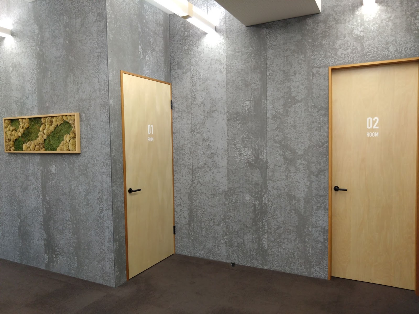 無機質なコンクリート調のデザインと木目調やグリーンの温かみが調和した、ナチュラルモダンな空間となっています。