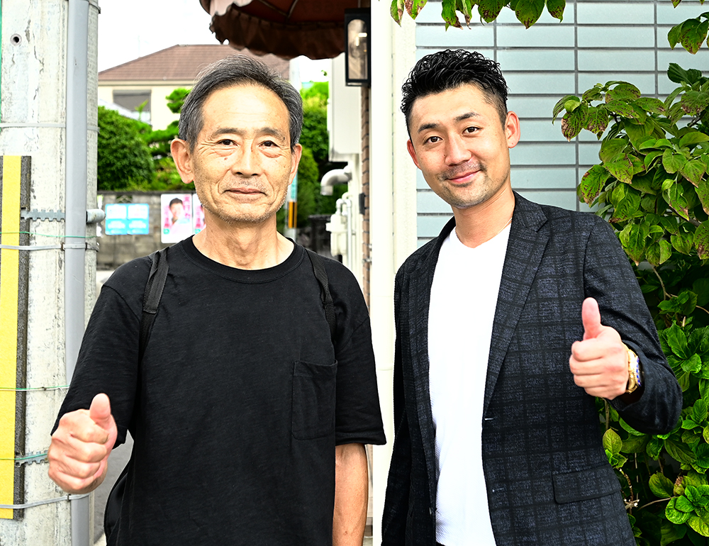 車を停めて、施工現場まで歩いているととっても嬉しそうに笑顔でこちらに手を振っていらっしゃって、最初私は、社長が高槻市生まれと聞いていたので、親戚やお知り合いの方なのかなと思っていたら、「創業当時のお客様」でした。近づくと、本当に嬉しそうな表情をされていらっしゃってまるで家族と再会したように近況のお話しをしながら温かな時間が流れました。