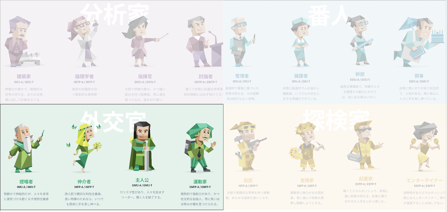 ・運動家:情熱的で独創心があり、かつ社交的な自由人。常に笑い微笑みの種を見つけられる
