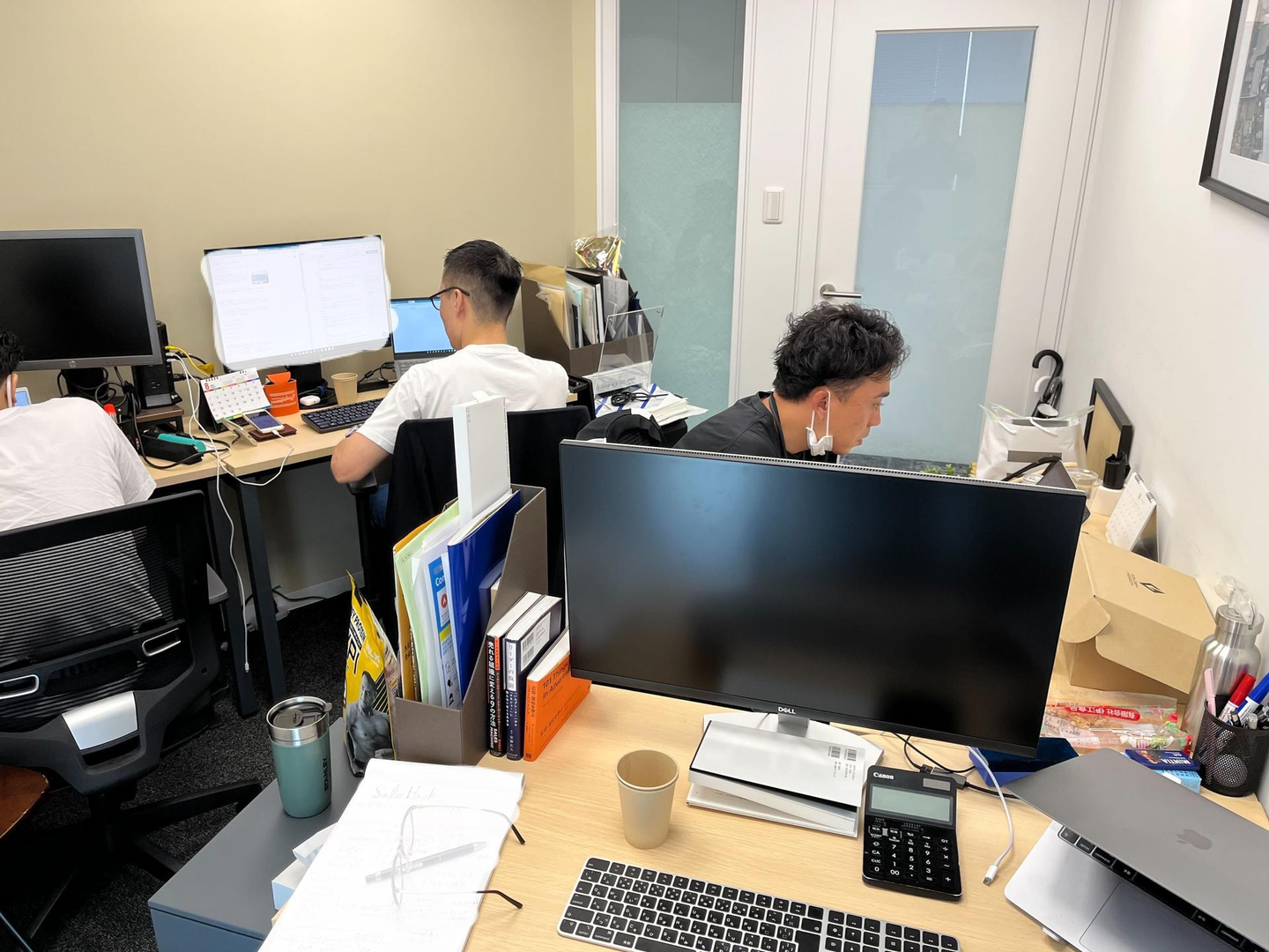 4つの机がギリギリ入る部屋で全員が同時に求職者の方とお電話やオンラインでの面談をすると