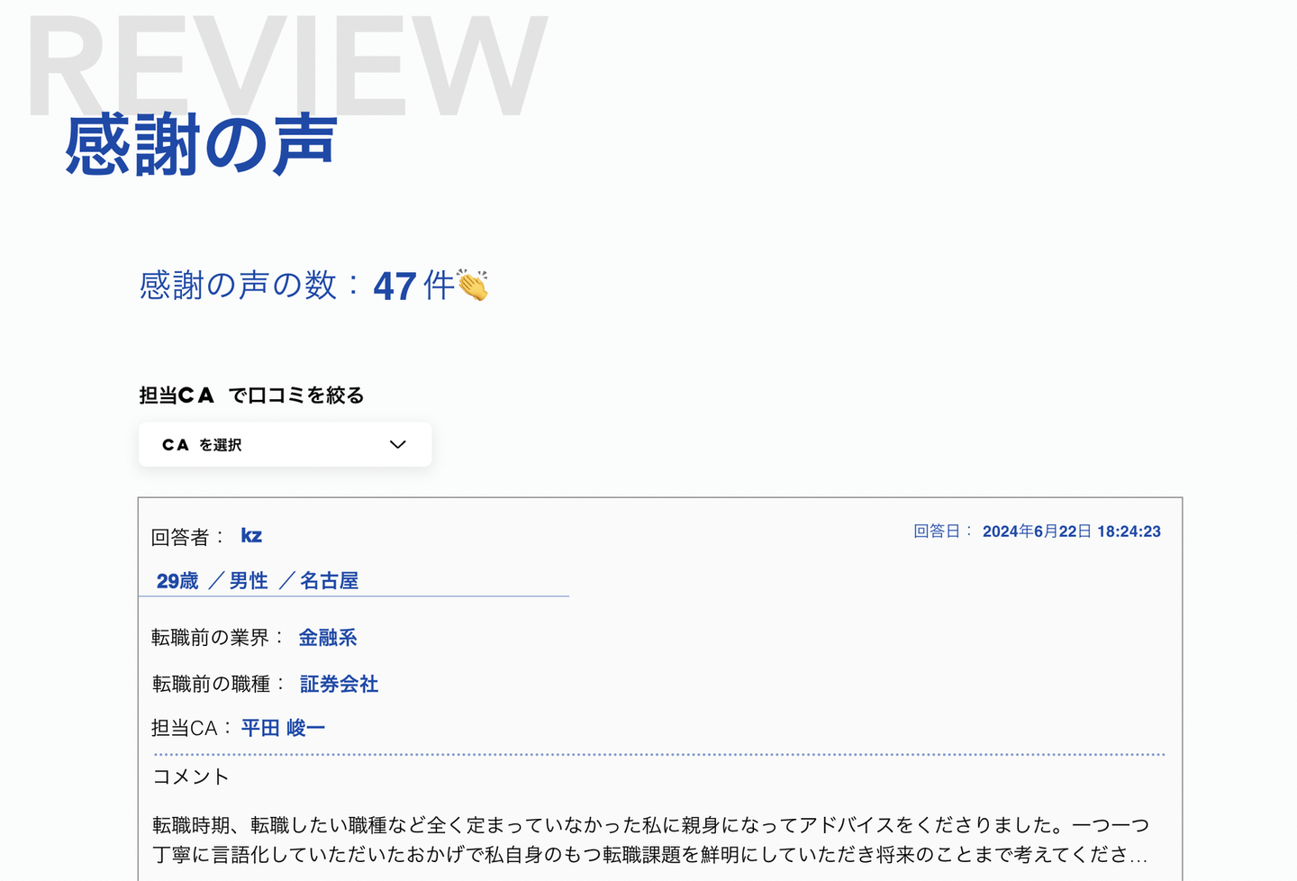 それに対する求職者様からの感謝のお声を記載をさせていただいております。