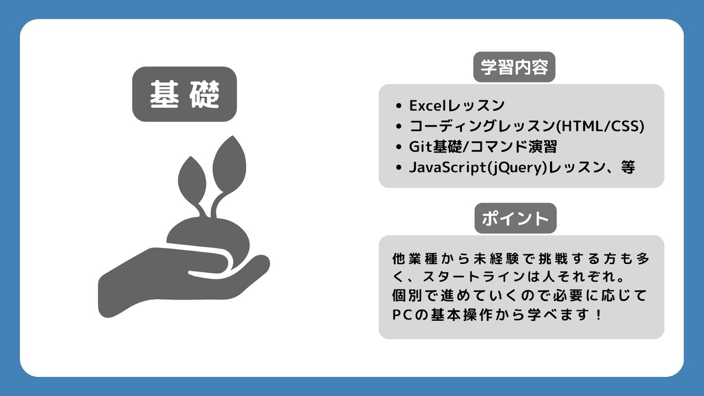 基礎研修では、WEB開発の軸となる知識を身に着けていきます。文章を読んで理論的に知識を詰め込んでいくのではなく、実際に手を動かしながら学ぶため、短期間で効率的に学ぶことが可能です。