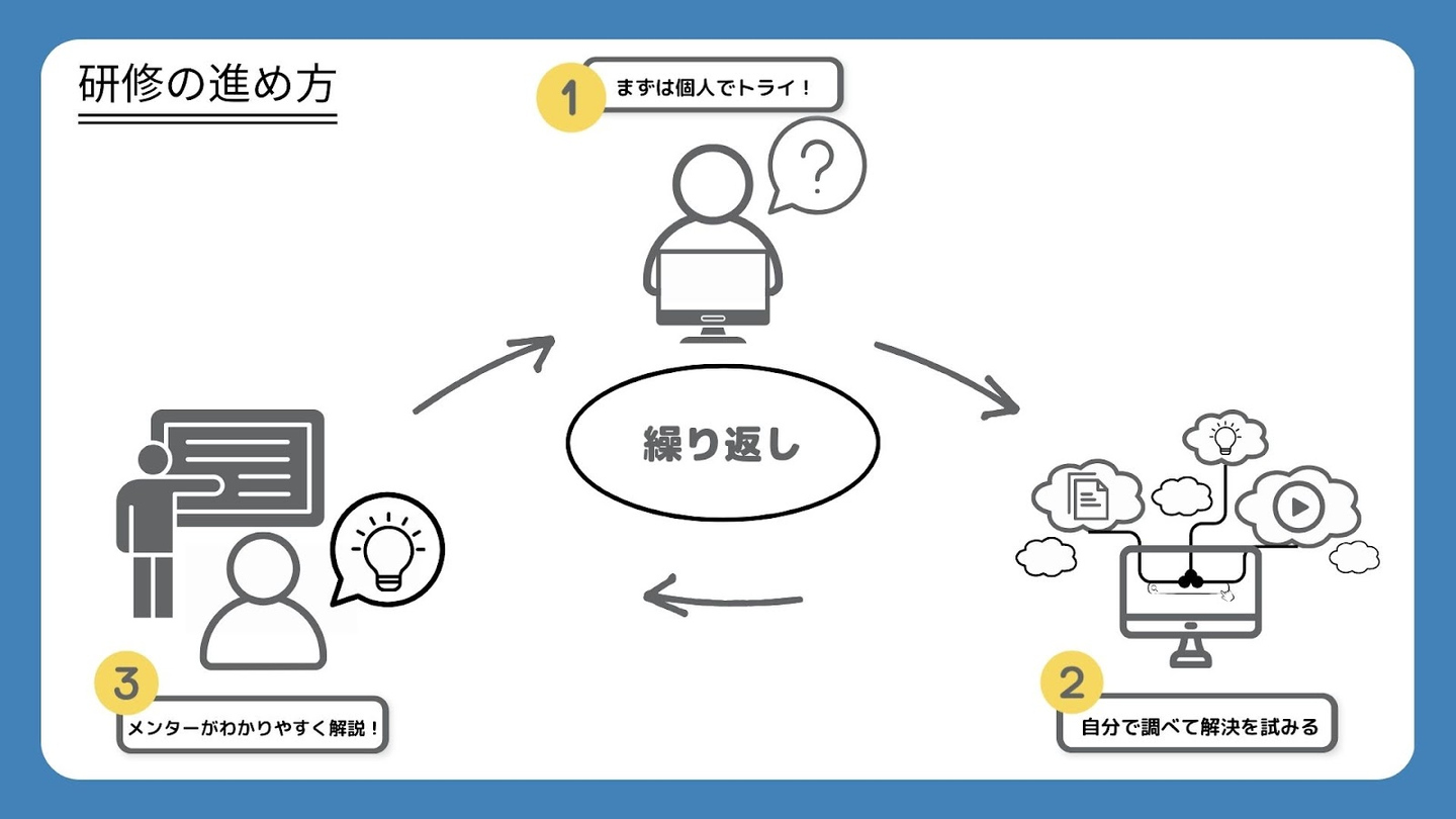 研修のやり方としては、まず個人でトライして、分からない部分があれば最初は自分で調べます。調べてみた結果解決しなかった場合はメンターに聞くというやり方を繰り返します。