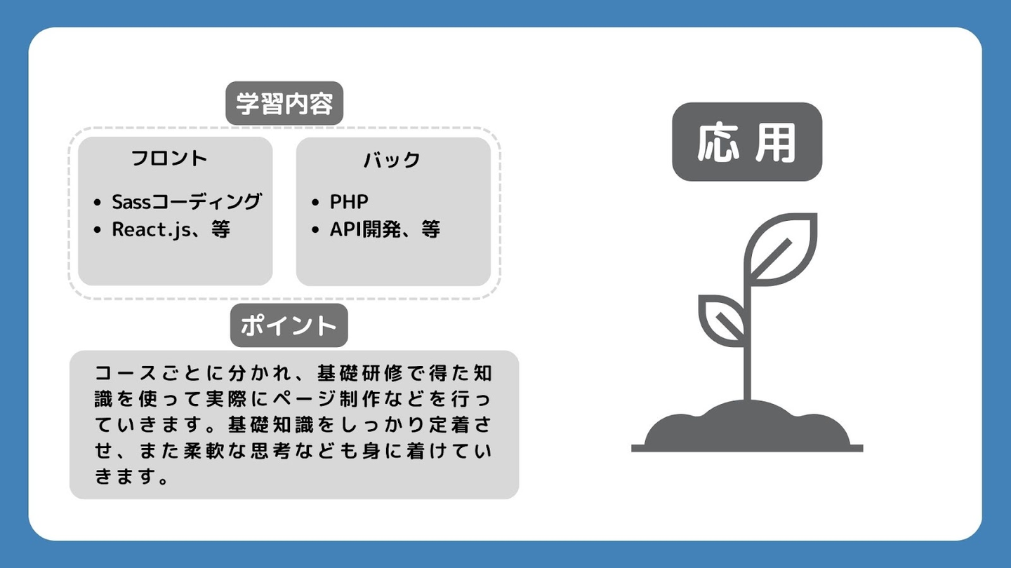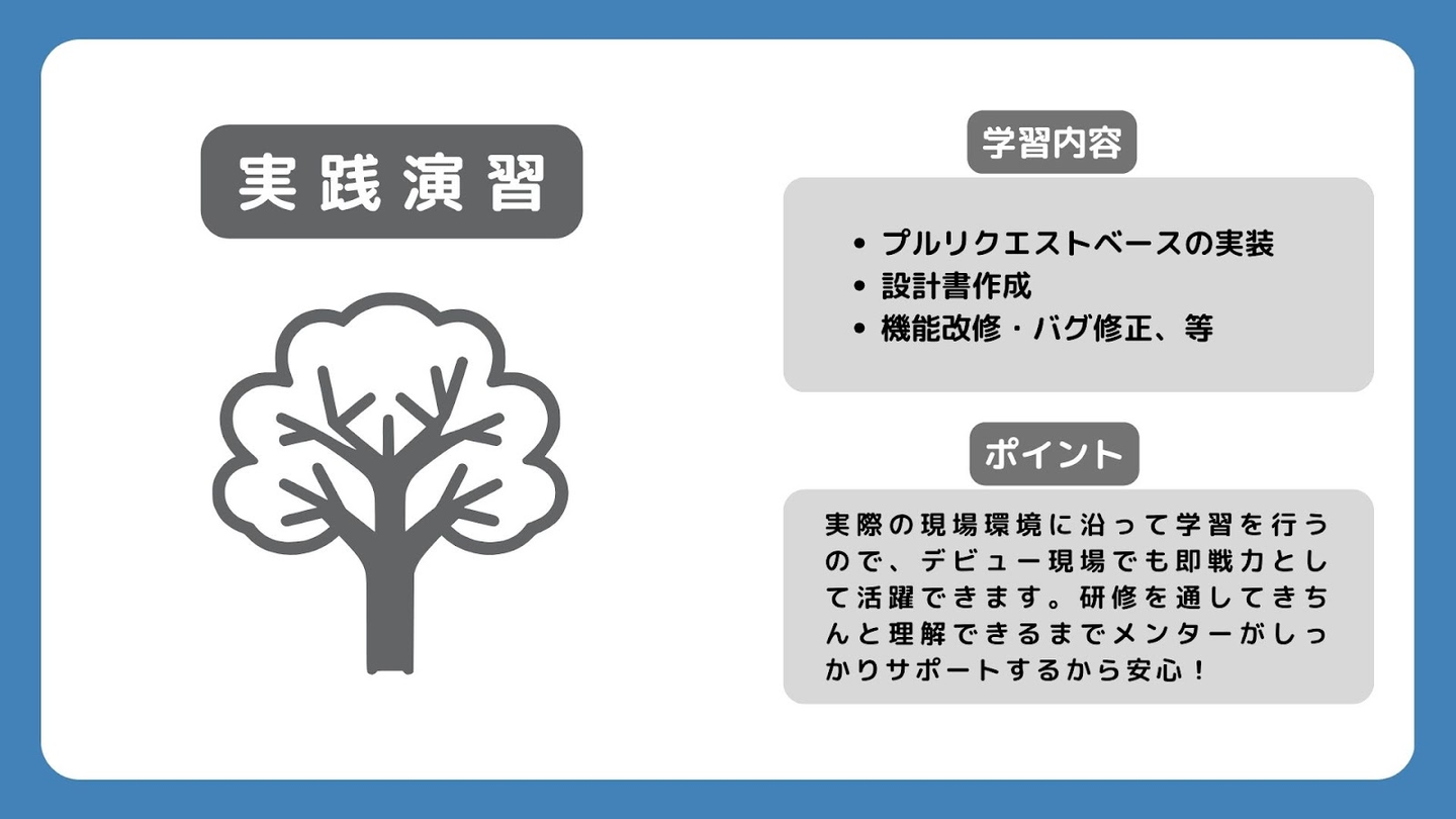 この期間では、基礎・応用・実践の3段階に分けて丁寧に研修を進めていくため、エンジニアとしてデビューしたてからすぐに現場で活躍できるような人材に成長することができます!