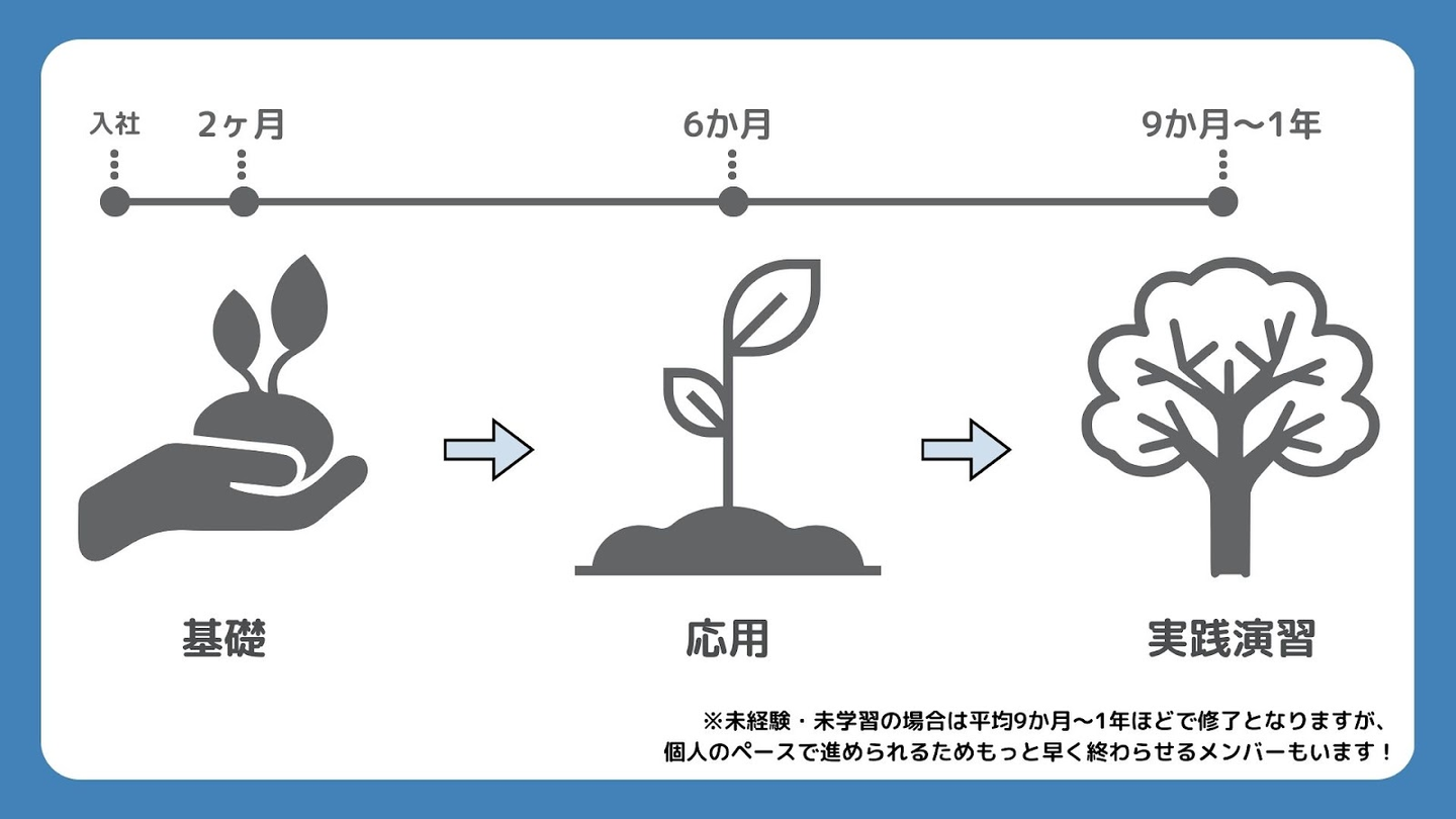 研修期間については特に期限は設けられておりませんが、未経験(未学習)の場合は平均して9か月〜1年ほどで修了となります。