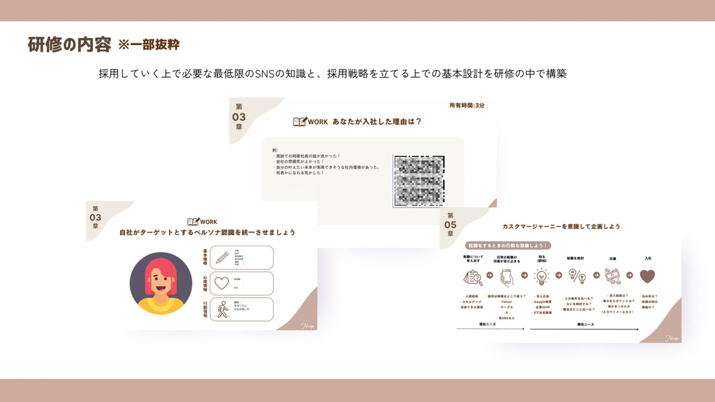 研修では、実践的なワークを行いながら、ターゲットユーザーに効果的に情報を届けるための発信スキルを学びました。具体的には、SNSでの投稿テクニック、フォロワーが共感しやすいビジュアルデザインやライティングの工夫、そしてインパクトを最大化するための投稿タイミングや表現手法についても深く掘り下げました。