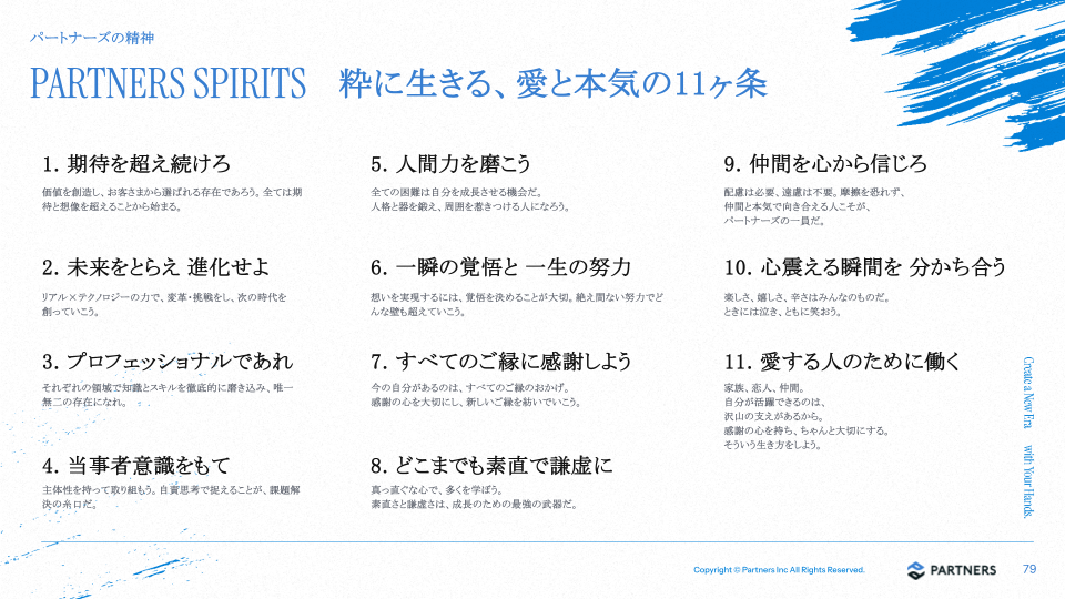 今回は、パートナーズの理念であり、行動指針「粋に生きる。愛と本気の11ヵ条」について紹介します。
