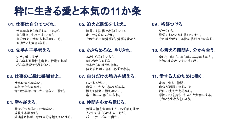 丈夫な木の根を生やすことができれば、よりスピーディーかつ太く大きな木になるように、企業にとっての根は理念であると考え、生み出されたのが「粋に生きる。愛と本気の11ヵ条」です。