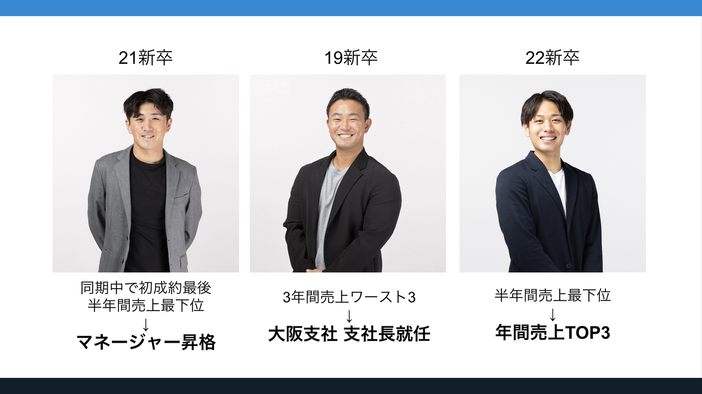 売上ワースト3だったメンバーや同期の中で成果が一番遅かったメンバーが諦めずに努力し続けた結果、他を引き離す勢いで大成しているメンバーもいます。