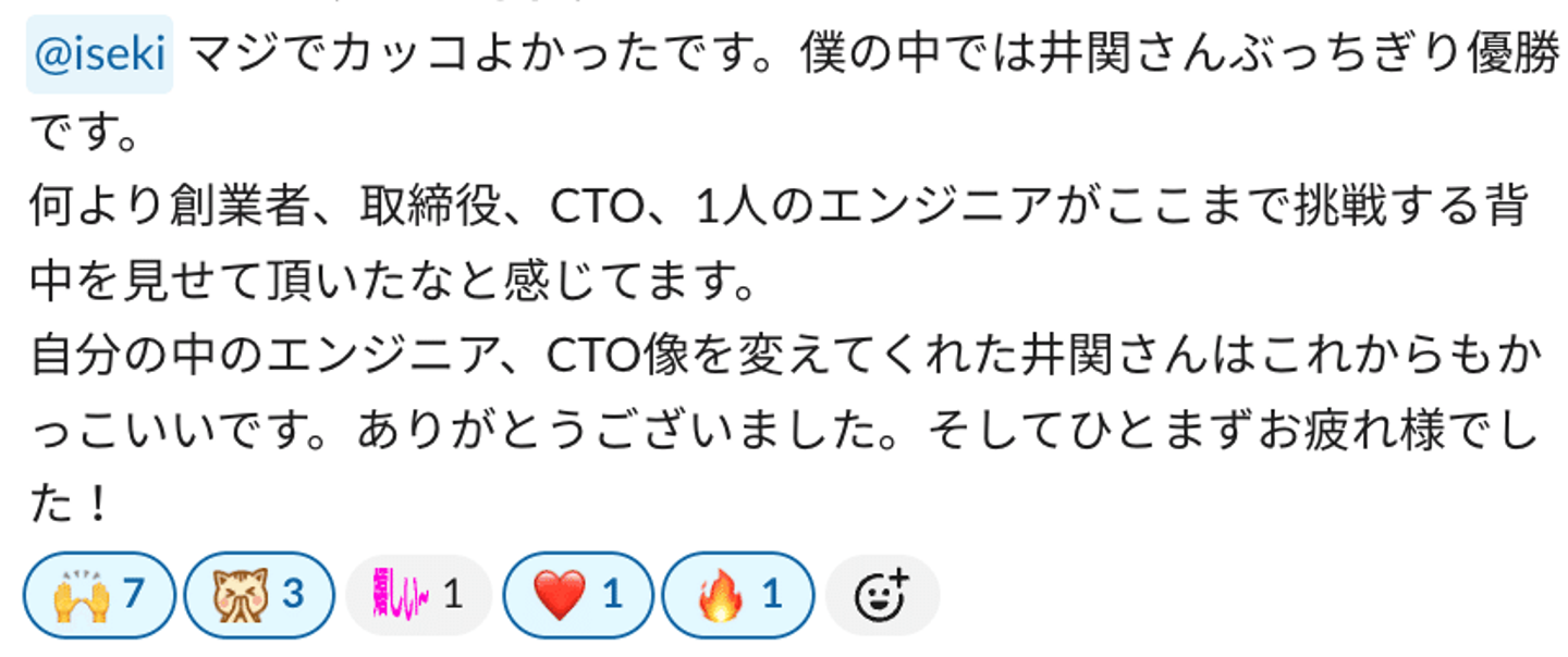 井関: もう一つの感想としては、最高の学びを得られたという点です。CTOという仕事は、「経営者 x 技術者」であり、 経営者として大胆な挑戦をしながらも、同時に技術者としての実現可能性を常に担保しなければいけない という側面でかなり孤独になりやすいポジションだと思っています。今回のCTO of the yearを通して、素晴らしいCTOの方々と切磋琢磨できた経験は、本当に得難いものでしたし、自分が憧れているCTOの方とも繋がることができて学びが深まりました。