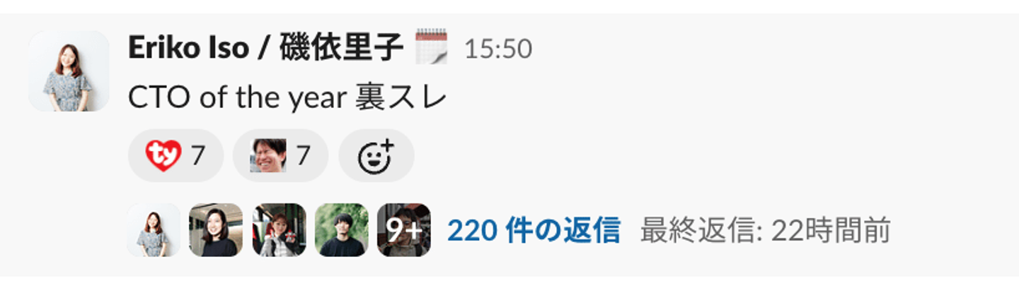 磯: 井関さん「推し活うちわ」だけでなく、Slackで裏スレッド作って全力で応援していました。全社で応援していたので、気づけばこのスレッドに、220件のコメントがついていますね (笑)