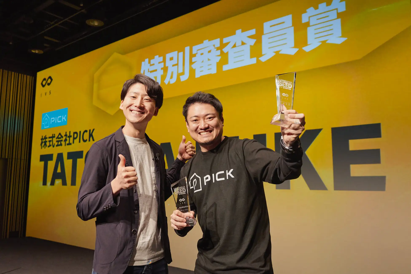 また、不動産テックへのチャレンジを始めて約1年ですが、徐々に成果も出始め、契約社数も増えてきました。2023年3月にはIVS※が主催するシードスタートアップに特化した「LAUNCHPAD SEED」にも初めて参加させていただいたのですが、約200社の応募の中から決勝に進出する10社に選出され、PICKは用意された4つの賞のうち「特別審査員賞」「オーディエンス審査員賞」「スポンサー賞(AWS様・Uniforce様)」の3つの賞を獲得することができました。