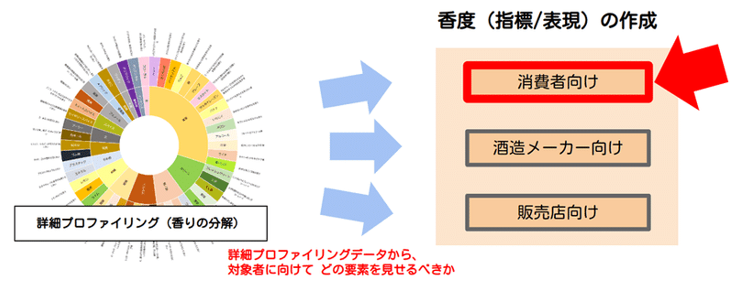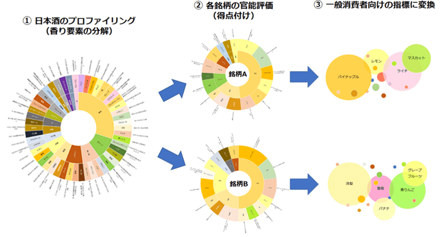 ワインのように日本酒にも香りを言葉で表す標準的な手法が体系化されれば、日本酒の魅力をより多くの消費者に届けることができるでしょう。また、今回のプロジェクトでは日本酒以外にも、「ウイスキー」、「フルーツ魚」、「柑橘」の香りの可視化についても検証を行っており、それぞれ有益なデータが得られています。