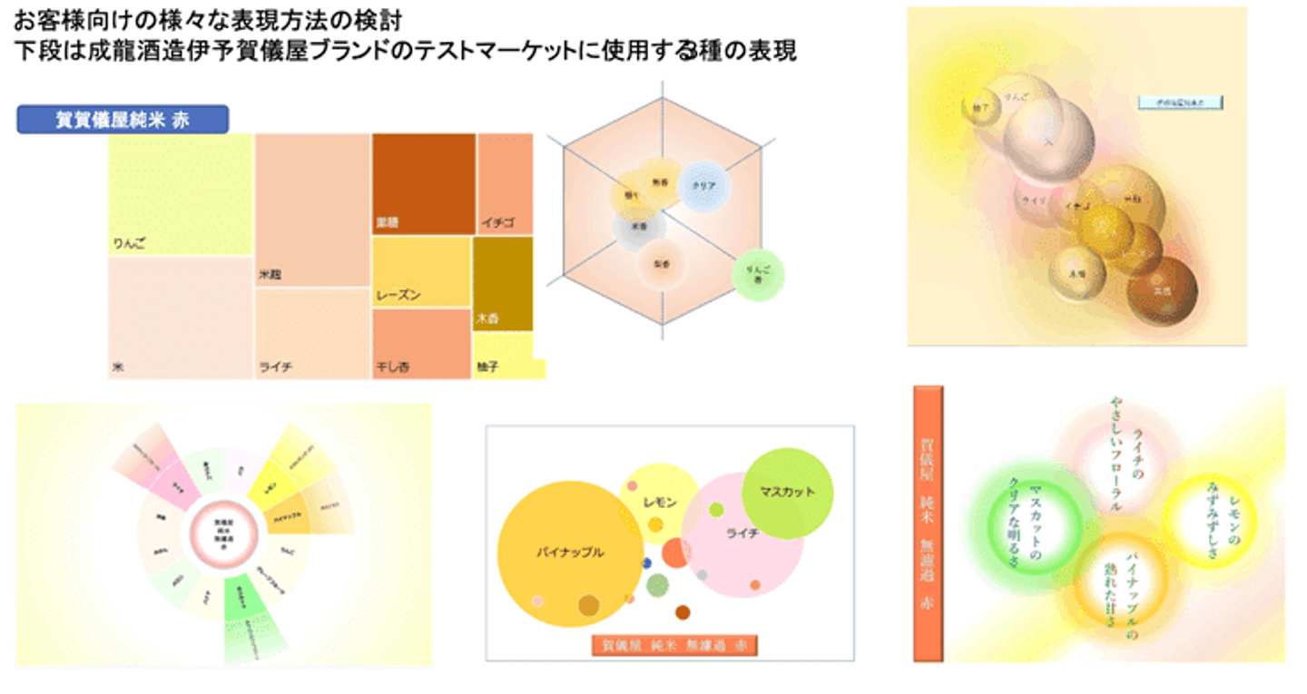 そこで、レボーン独自のソリューションによって日本酒の香りを「香度®」として可視化し、“えひめ香る”のキャッチコピーとともに販売された「愛媛さくらひめシリーズ」のマーケティングに活用を検討。今回、商品発表にて全22銘柄の香りを展示する機会を得て、同社の技術「香度®」による日本酒の香りの可視化を試みました。