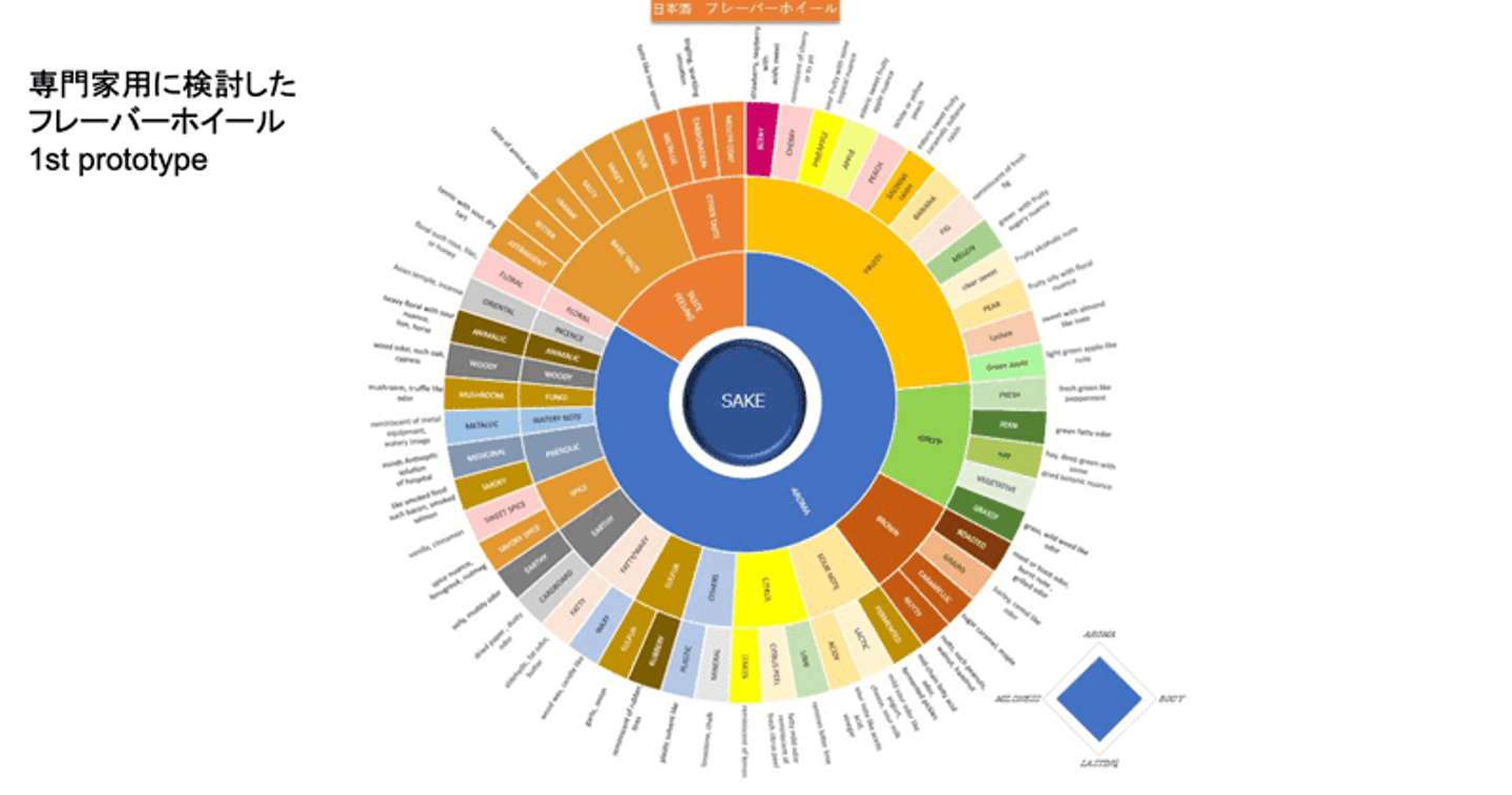これは、ファーストステップの「官能評価用語の確立」で、実際に日本酒を確認しながら、日本酒の香りに関する表現を中心とした評価ワード「日本酒フレーバー(アロマ)ホイール」です。