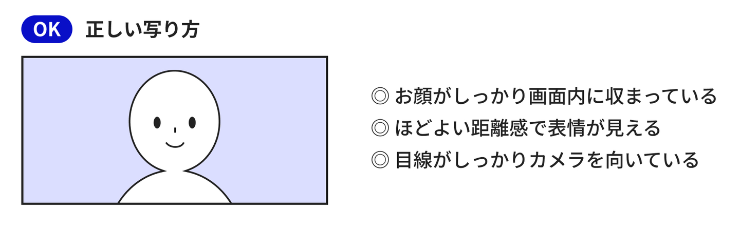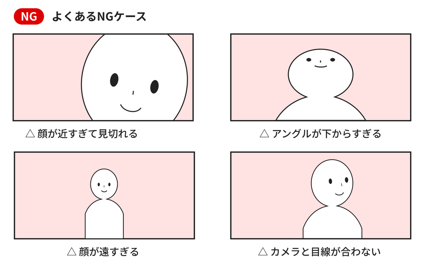 ありがちなミスとしては、カメラに近すぎて画面からお顔が見切れていたり、逆にカメラから遠すぎて表情がよく見えなかったり、カメラの位置が下すぎて煽るようなアングルになっていたり……というケースが見られます。