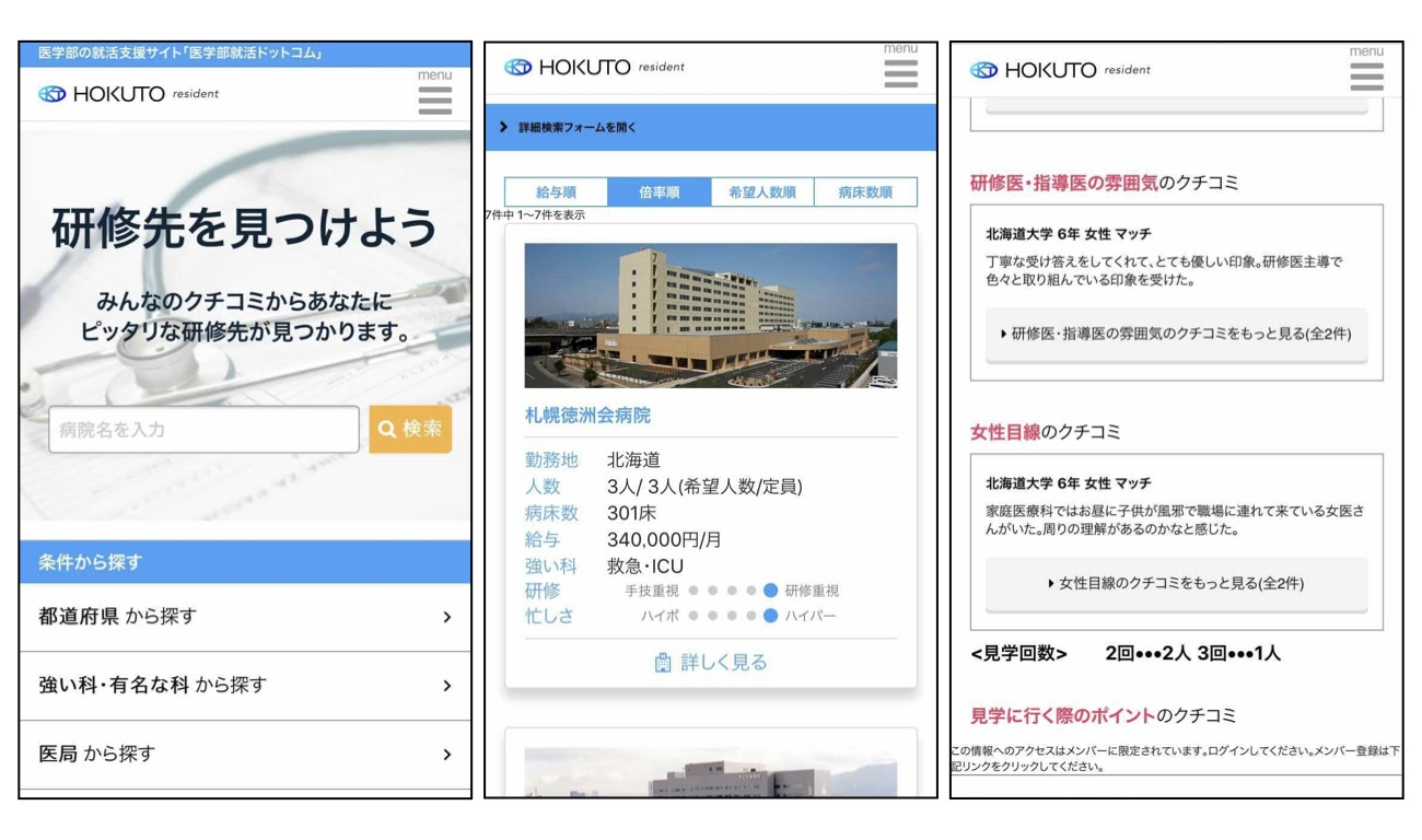 なかなかヒントを得られず、各都道府県を回って東京まで戻ってきたところ、慶應大学の医学部生と話す機会がありました。彼らは先輩が研修先の感想をまとめた冊子を後輩に渡すという伝統がありました。ちらっと中身を見せてもらったところ、たくさんの口コミがまとめられていて感動し、「これの全国版を作ろう」と決めました。作るべきサービスの方向性が決まり、引き続き全国を行脚しながら口コミを集め、2018年1月に「HOKUTO resident」をリリースしました。