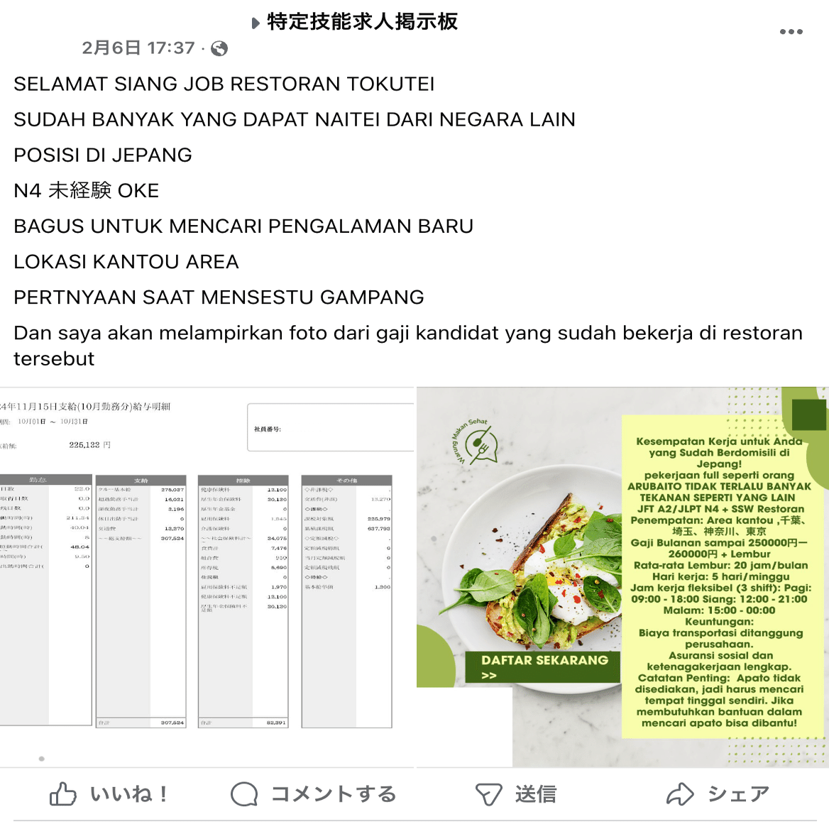 これはあるFacebookグループでの投稿キャプチャ|給与明細(個人名あり)を添えて求人募集してる