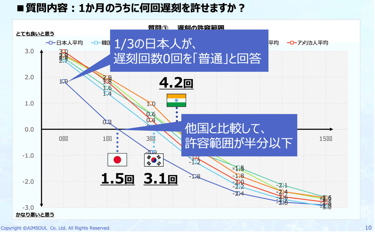 韓国では月3回まで、インドネシアでは月4回まで許容される一方、日本では月1回がぎりぎりの許容範囲で2回目からは不可というシビアな基準。また、遅刻0回については、他国では高く評価される一方、日本では「当然のこと」という認識でした。