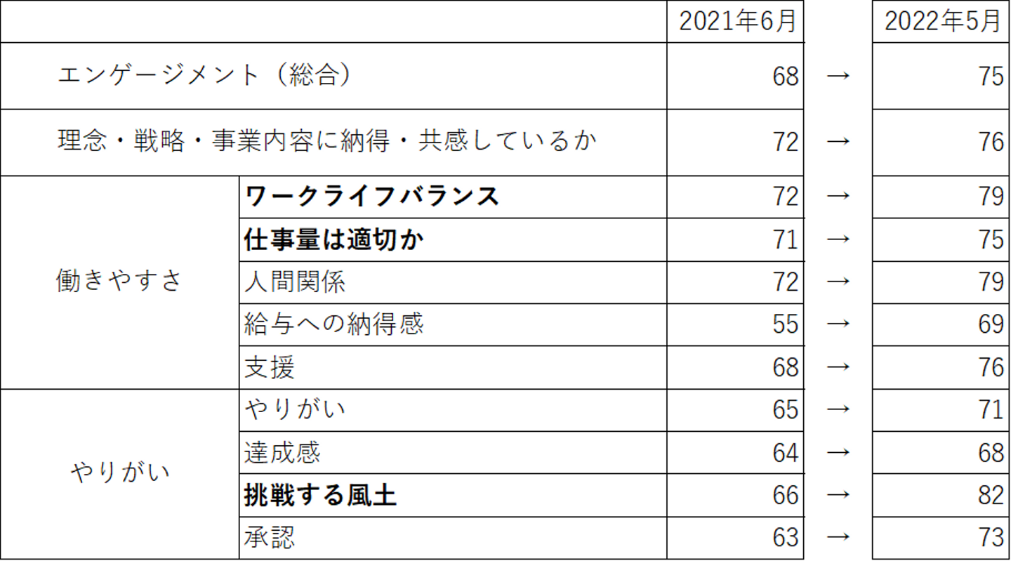 ここに記載したスコアだけではなんか上がっているんだなという感じでしかありませんが、WEVOXでのベンチマーク値と比較すると、【働きやすさ】の各スコアはベンチマークよりも高く、特にワークライフバランスと仕事量が大きく上回っています。【やりがい】の各スコアはベンチマークと同じくらいで、挑戦する風土のみ大きく上回っています。