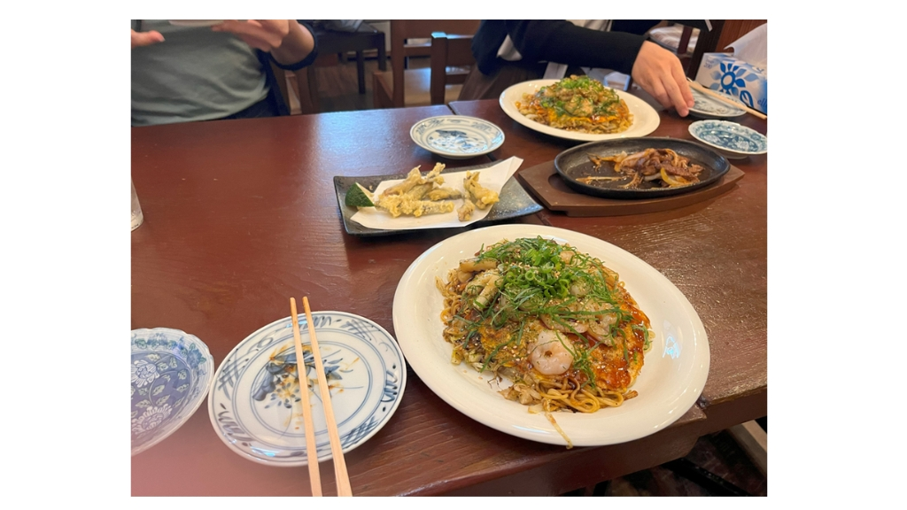 昼ごはんは、広島名物の広島焼き!地元ではいわしを天ぷらにする習慣があるそうで、それを堪能しました。また、ジビエ料理のいのししもいただき、広島のグルメを思う存分楽しみました。