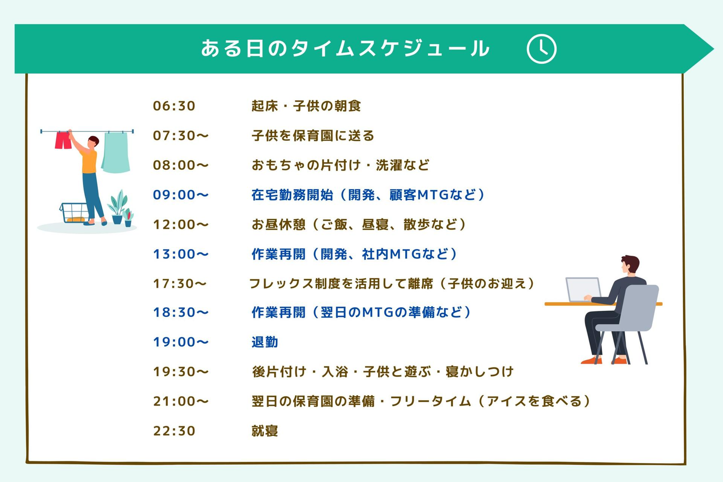 フレックス勤務のおかげで、業務の進捗を見ながらスケジュールを調整し、子どもを迎えに行くことができています。もし固定時間制の勤務だったら、お迎えの時間に間に合うように業務を終えるのは難しく、毎日慌ただしく過ごしていたかもしれません…。