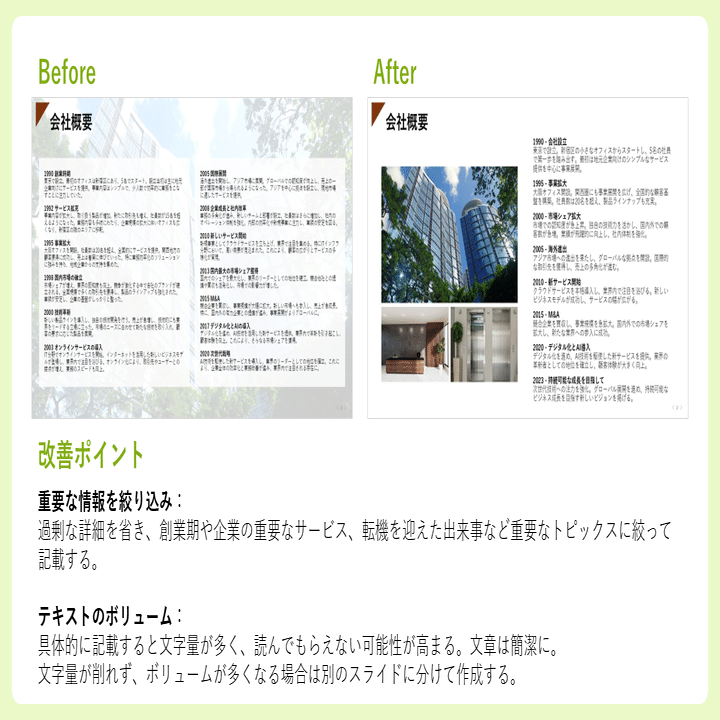 改善ポイント:沿革は簡潔に。創業期や事業のターニングポイント、インパクトを与えたサービスのリリースなど、会社を代表するトピックスをピックアップすることが重要です。また、テキスト量は必要最小限に簡潔にまとめましょう。